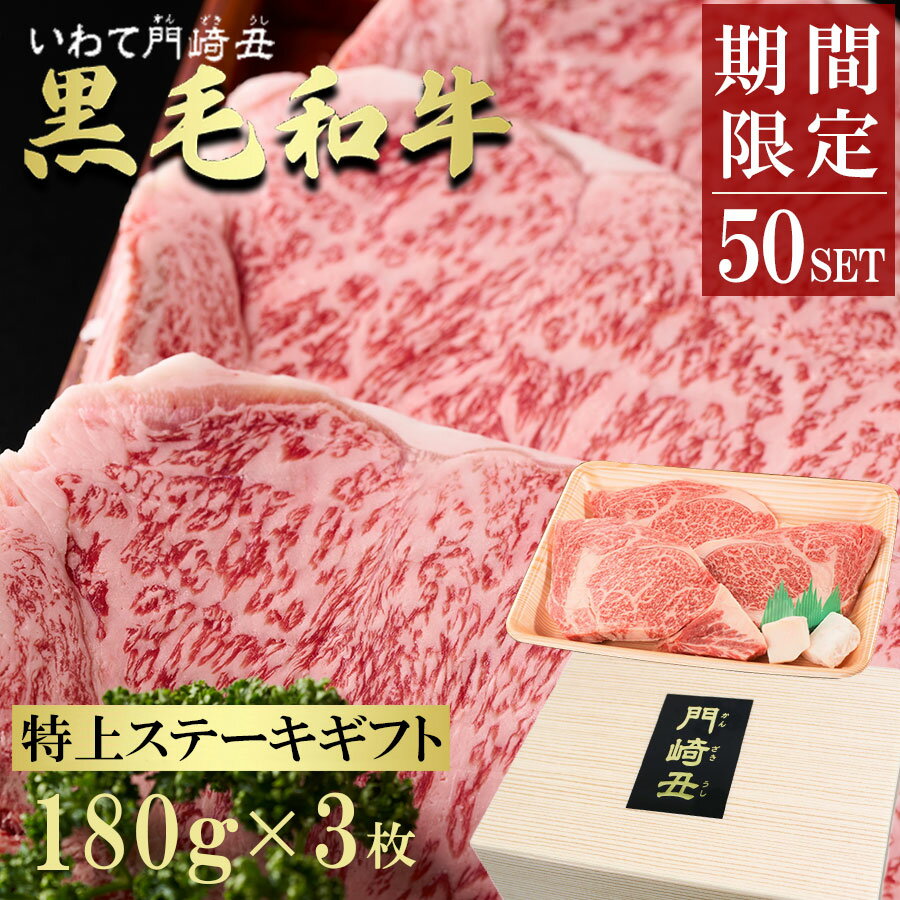「[お歳暮 ギフト] [数量限定] 黒毛和牛 ステーキ 540g 和牛 国産 牛肉 熟成肉 お肉 冷凍 霜降り 肉厚 ステーキ ギフト 鉄板 焼肉 お歳暮 クリスマス お正月 お中元 手土産 贈答 誕生日プレゼント 内祝い お祝い 人気 いわて門崎丑 特上ステーキ 約180g×3枚 自社牧場直送」です。