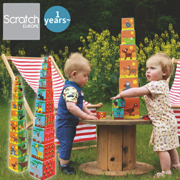 スクラッチ スタッキングタワー アニマル キューブブロック 出産祝い、ハーフバースディ、1歳、2歳の男の子、女の子の誕生、クリスマスプレゼントに人気。ベルギー生まれのScratch スクラッチの知育玩具。