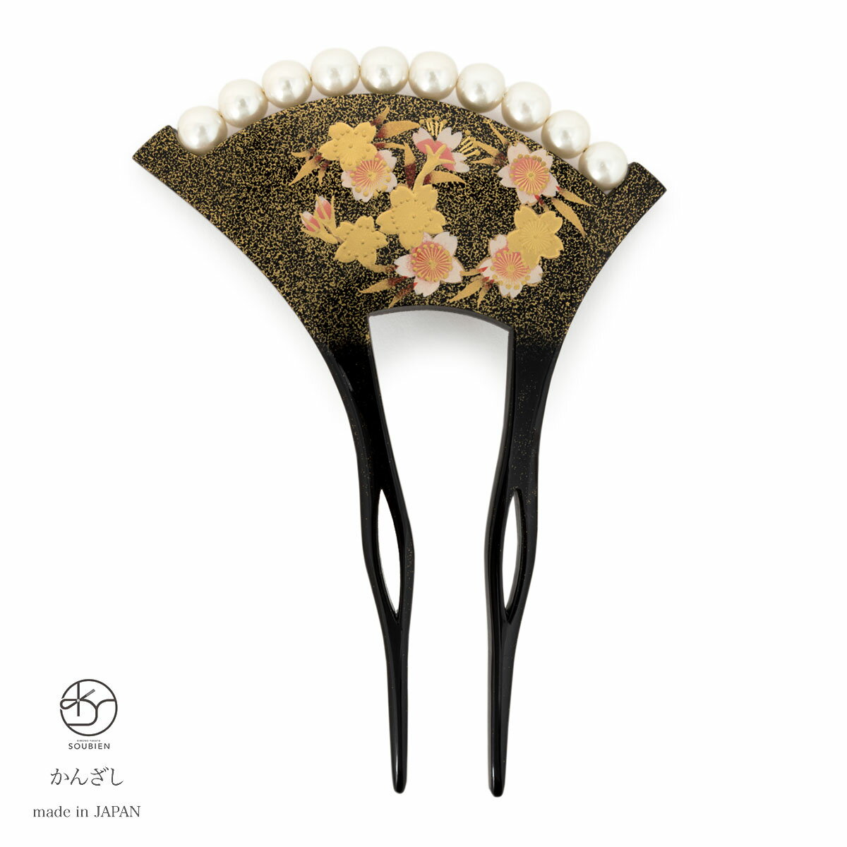 かんざし バチ型 簪 髪飾り 黒 ブラック 桜 花 蒔絵調 パールビーズ 二本足 かんざし フォーマル 日本製 成人式 卒業式 結婚式 パーティー 着物 和装【あす楽対応】
