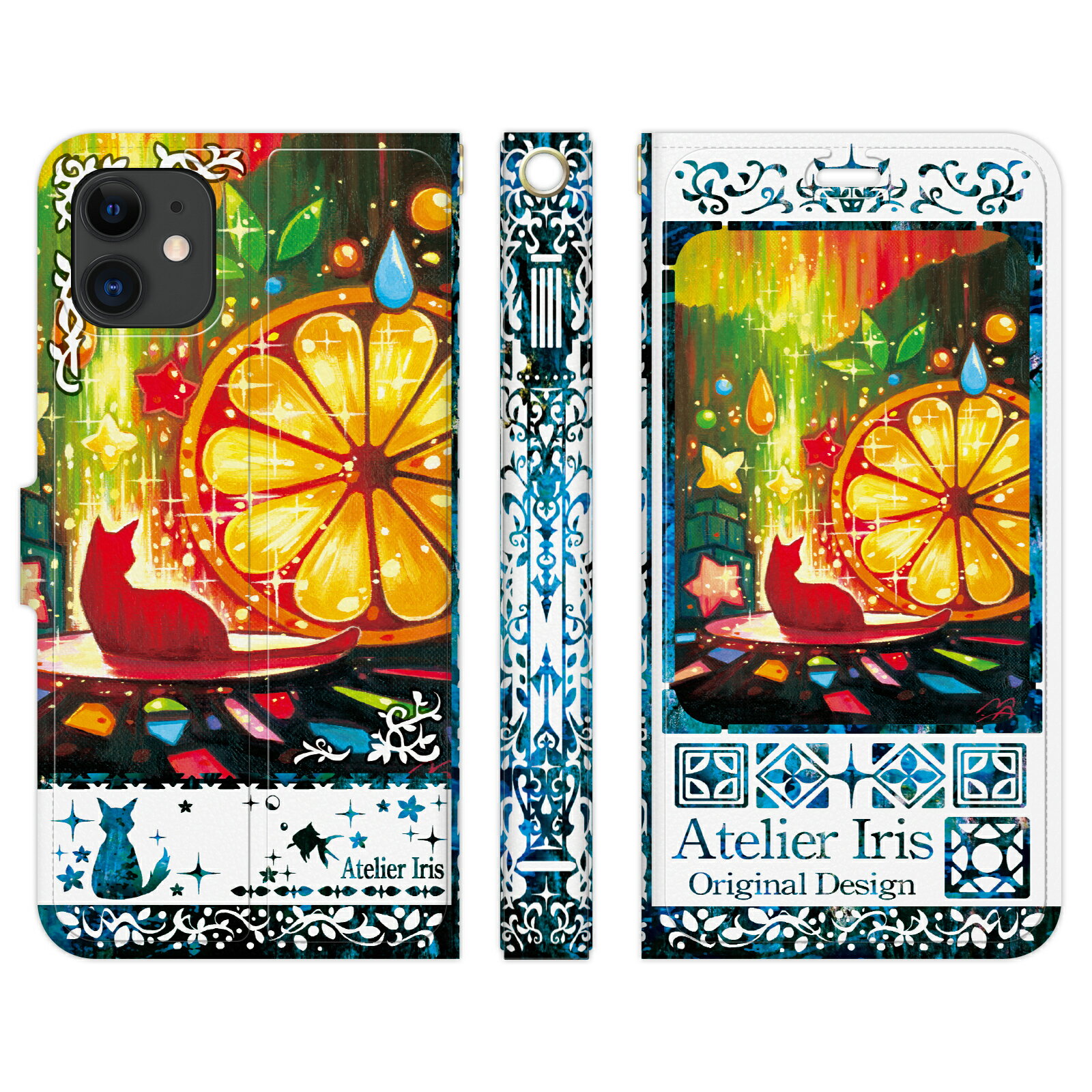 iPhone 13 ベルトなし 手帳型 ケース カバー オレンジな気分 白地 ブルー アトリエアイリス 猫 動物 かわいい 油絵 デザイン イラスト オレンジ みかん カラフル 楽しい 折りたたみ カード入れ ポケット iPhone13 サーティーン 二つ折り アイフォン アイホン アイフォン13
